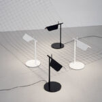 This futuristic table lamp was created by the British design team of Edward Barber and Jay Osgerby. jointly named Designers of the Future at Design Basel/Miami in 2006. The duo characterizes their approach to every design challenge: We seek to re-evaluate the archetype. to challenge precedents. Their design features a tent-like head of painted aluminum that swivels 45° to direct light on your desk or to aid reading on the couch. The multi-led diffuser is specially designed to avoid the multi–shadow effect of multiple LEDs. Made in Italy by Flos. a manufacturer which reproduces many of the iconic lighting designs in MoMA’s collection. Designed by E Barber and J Osgerby for FLOS.